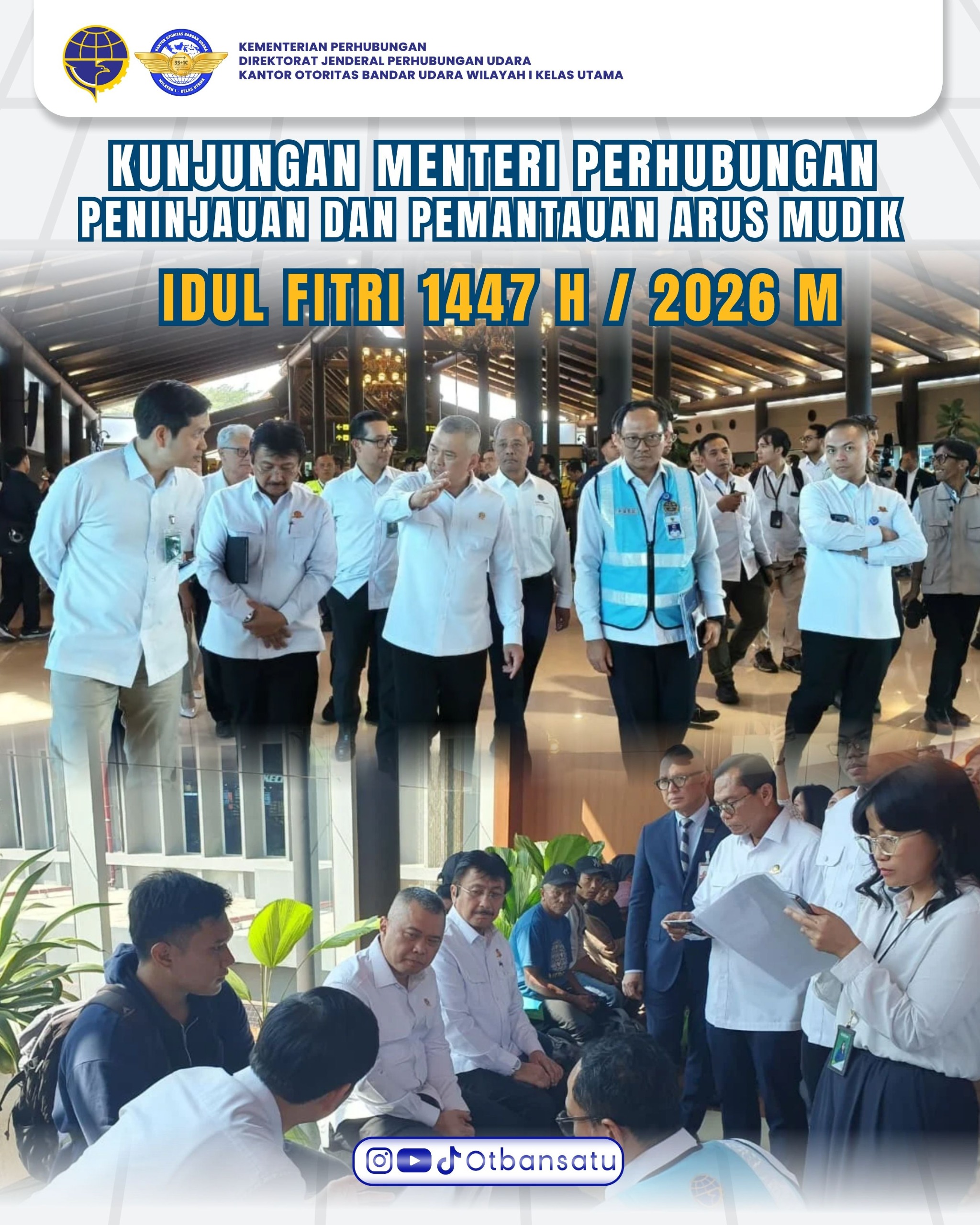 16 Mar Kunjungan Menteri Perhubungan Peninjauan Arus Mudik 16 Mar 2026 Kategori: Bandara 5 Senin, 16 Maret 2026 - Menteri Perhubungan beserta Direktur Jenderal Perhubungan Udara melaksanakan peninjauan dan pemantauan arus mudik angkutan lebaran tahun 2026/1447H di Bandara Internasional Soekarno-Hatta Gallery & Files Share: